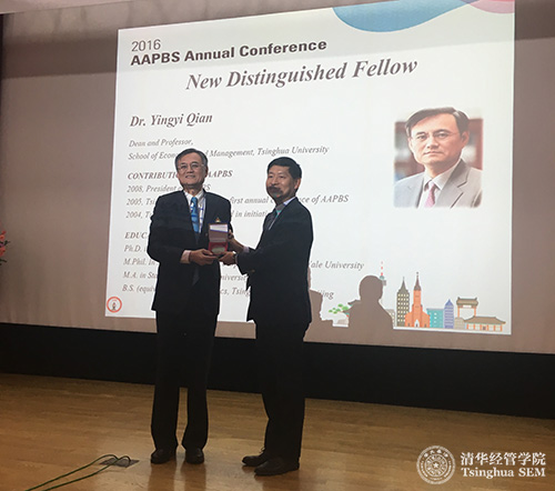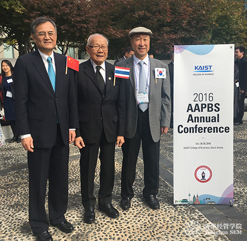 2016年10月27日,清华经管学院院长钱颖一教授受邀参加在韩国首尔举办的亚太管理学院联合会(Association of Asia-Pacific Business Schools, AAPBS)年会作主旨演讲,并被授予“杰出会士”(Distinguished Fellow)称号。本次年会主题为“管理教育创新:亚太地区面临的挑战”。会议由韩国KAIST大学商学院(KAIST College of Business)主办。