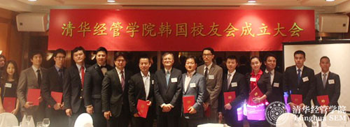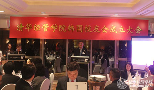 2016年10月27日,清华经管学院韩国校友会成立大会在韩国首尔举行。清华经管学院院长钱颖一教授,中国驻韩国大使馆大使邱国洪,中国驻韩国大使馆教育参赞艾宏歌,韩国前总理、韩国国会议员、清华科技园顾问委员会主席李海瓒,韩国前环境部长、清华科技园顾问委员会委员李致范,清华经管学院党委副书记焦捷教授等出席大会。大会由任美娜(经2012)主持。