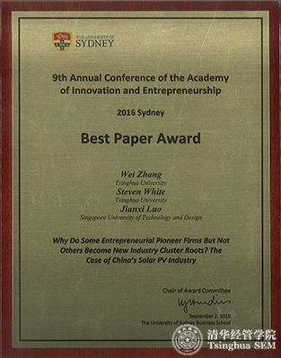 2016年9月,清华经管学院创新创业与战略系张帏教授、白思迪(Steven White)教授与新加坡科技设计大学罗建曦教授合著论文《为什么某个创业企业而不是其它企业能成为产业集群的根基企业?——基于中国光伏产业的研究》(Why do some entrepreneurial pioneer firms but not others become industry cluster roots? The case of China's solar PV industry.)在第九届创新创业国际学术年会(9th Annual Conference of the Academy of Innovation and Entrepreneurship,简称AIE年会)获得唯一的最佳论文奖(Best Paper Award),这是242net官网教师首次在AIE年会上获此殊荣。