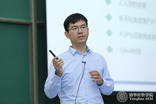 开课仪式结束后,张适时以“P2P的发展与未来”为主题,开始了首次课程的讲授。他从P2P是什么、人人贷的故事、多元化角度看P2P、P2P与互联网金融行业展望四个层面为同学们深入浅出地介绍了P2P的情况。张适时以人人贷为例对比了国内外P2P的差异,并从个人消费金融行业、个人财富管理行业及商业模式三个角度分析了中国P2P的发展趋势,他指出在未来5到10年P2P会进入更偏寡头的时代,创业门槛将不断提升。