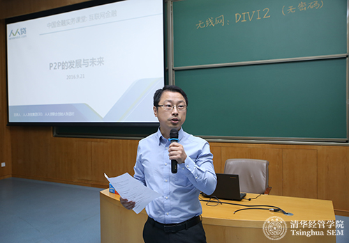2016年9月21日晚,由清华经管学院、中国金融四十人论坛、人人贷商务顾问(北京)有限公司合办的《中国金融实务课堂3-互联网金融》开课仪式暨系列课程第一讲在清华经管学院舜德楼401举行。清华经管学院党委书记高建教授,副院长徐心教授,金融硕士项目主任刘淳教授,中国金融四十人论坛秘书长、金融实务课堂3开课仪式特邀嘉宾王海明,人人友信集团CEO、人人贷联合创始人、首节课程主讲人张适时(经2003)参加了开课仪式。开课仪式由清华经管学院金融系庞家任教授主持。
