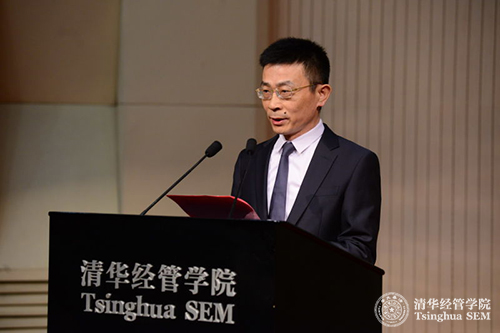 在学生发言环节,EMBA2010级A班的王爱国(青岛国恩科技发展有限公司董事长兼总经理)作为老生发言。他分享了自己在清华经管EMBA学习的感受,“通过高滨老师《金融与财务原理》的系统学习,让我真正懂得并深刻理解了资本市场和金融杠杆对实体经济的助推作用,并启动了自己的企业上市,实现了真正意义上的学以致用。”
