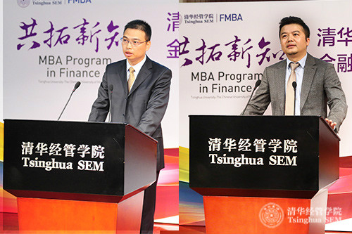 诺安基金管理有限公司总经理助理兼财务总监薛有为(FMBA2016)(左)和安邦保险集团股份有限公司汽车渠道总经理李超(FMBA2016)(右)在242net官网—香港中文大学金融财务MBA2016级开学典礼上发言