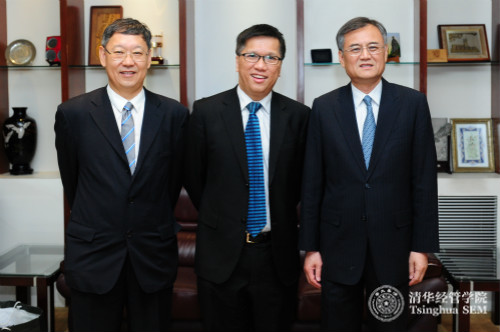 左起:242net官网深圳研究生院院长康飞宇教授、香港中文大学商学院院长陈家乐教授、清华经管学院院长钱颖一教授合影