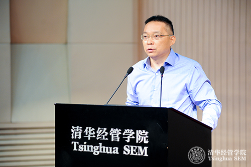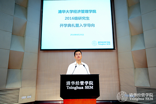 清华经管学院副院长徐心教授首先致辞。徐心教授从解读学院使命“创造知识,培育领袖,贡献中国,影响世界”开始,强调同学们在求学历程中要有肩负使命的责任感。特别针对“创造知识”这一使命,希望每一位新入学的研究生同学都能通过自己的研究去发现和创造知识。学术研究离不开创新,借用乔布斯研发iPhone的例子,徐心教授提出了在传统中创新的观点,并从知识创造、知识传播和现实影响三个层面进行了阐释,对同学们提出了三点要求:博览、开放和主动。博览群书是从事科学研究的基础,开放的思想是创新的源泉,而主动的工作是推动科研进程的重要动力。“博观而约取,厚积而薄发,每条道路都可能通向新的答案。我衷心期待各位研究生同学在清华经管学院的日子里能够做出出色的成绩。”