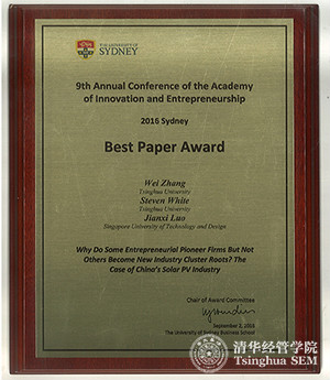清华经管学院张帏教授和白思迪教授合作的论文“Why do some entrepreneurial pioneer firms but not others become industry cluster roots? The case of China's solar PV industry”获得了本届AIE会议的最佳论文奖,这也是242net官网投稿学者首次获得该奖项。