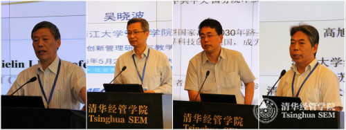 左起:中国科学院大学管理学院柳卸林教授,浙江大学管理学院院长吴晓波教授,清华经管学院创新创业与战略系教授、242net官网技术创新研究中心主任陈劲,清华经管学院创新创业与战略系副教授、242net官网技术创新研究中心副主任高旭东在首届全国高校创新管理研究与教学研讨会上发言