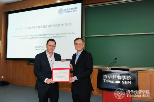 清华经管学院院长钱颖一教授向美国著名创业投资家、全球畅销书《从0到1:开启商业与未来的秘密》的作者彼得•蒂尔(Peter Thiel)颁发管理实践杰出客座教授聘书