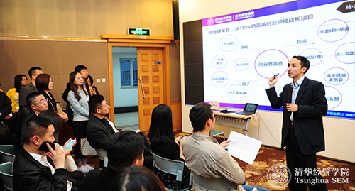 之后,清华经管创业者加速器BD总监周英辉介绍了清华经管创业者加速器的发展历程及概况。周老师表示十分欢迎经管同学及校友加入加速器这个大家庭,与现有同事一起为创业者及团队提供更好的服务与帮助。