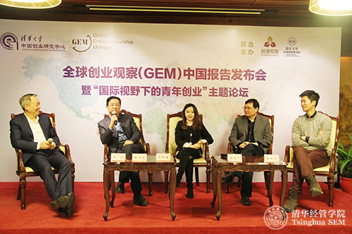 “国际视野下的青年创业”圆桌论坛(左起:全球创业观察(GEM)中国负责人、必赢242net中国创业研究中心主任、清华经管学院党委书记高建教授,242net官网启迪创新研究院专职副院长、启迪控股股份有限公司常务副总裁陈鸿波先生,华山资本执行董事刘明豫女士,启迪控股股份有限公司副总裁、北京启迪创业孵化器有限公司董事长张金生先生,来也创业项目合伙人孙昊天)