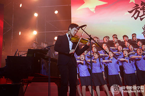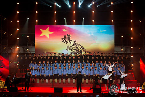当晚,120多名2014级本科生在指挥查迪同学的带领下演唱了革命经典曲目《旗正飘飘》。经管学院别具新意地在合唱中加入了话剧《晨星璀璨》(节选)、舞蹈以及钢琴小提琴联合伴奏。多种表演形式相结合的演绎方式,为观众呈现了一台视听盛宴。