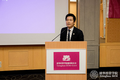 清华经管学院欧洲校友会德国分会会长赵京石在之后的发言中代表欧洲校友会德国分会向学院领导、嘉宾以及各校友的到来表示欢迎。他表示,随着学院的不断发展、国际化教学理念的不断深入,越来越多的清华学子远赴德国深造或工作,这些校友是活跃在各行各业的精英。此次学院成立德国校友会,为广大海外校友搭建了交流平台,具有深刻意义。德国校友会将作为一个开放的平台为广大校友提供互相联络、彼此促进、共创价值的机会,以期回馈学院,报答祖国。最后,他向所有参与筹建欧洲校友会德国分会的校友表达了感谢。