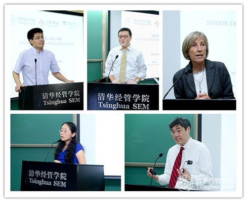 三方代表致辞(左上起:清华经管学院副院长、市场营销系系副主任陈煜波教授,中欧国际工商学院副教务长、SEPC课程联席学术主任王高教授,哈佛商学院高级副院长林恩·佩因(Lynn Sharp Paine)教授,清华经管学院会计系主任、课程联席学术主任肖星教授,哈佛商学院课程联席学术主任丹尼斯•姚教授)