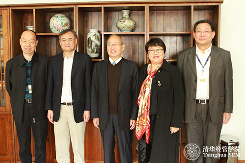 清华经管学院钱颖一院长与交通银行董事长牛锡明会见(左起:交通银行党委副书记、监事长宋曙光,清华经管学院院长钱颖一,交通银行党委书记、董事长牛锡明,清华经管学院高管培训中心主任李剑青,交通银行培训中心主任李小敏)