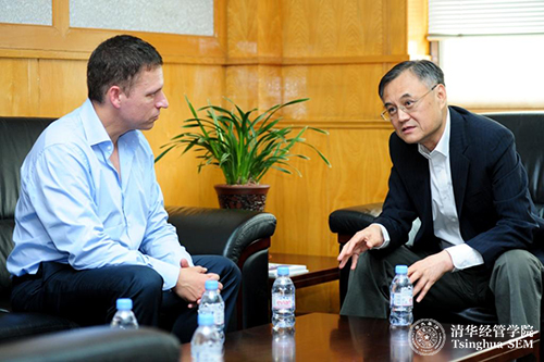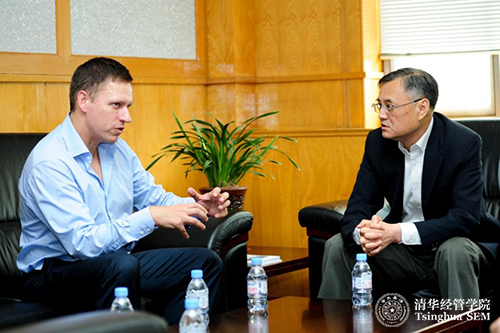 钱颖一院长对彼得•蒂尔先生来到清华经管学院表示欢迎。钱院长向他介绍了学院的情况,并与他就中国经济发展形势、创新创业环境以及经济管理教育等方面的问题进行了愉快的交流和和深入的讨论。