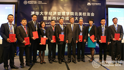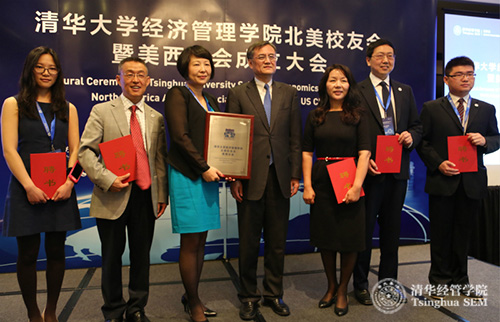 清华经管学院院长钱颖一教授(左4)为北美校友会美西分会揭牌并颁发聘书