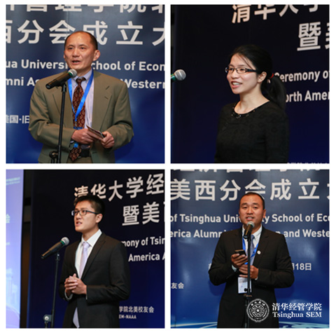随后,王强(经硕1987)、曾洁银(经2006)、彭兆盟(经双2007)、许旭升(EMBA2012)四位校友代表进行分享。他们叙述了自己在清华经管学院的求学经历,回顾了在求学期间的师生情谊,同时感谢学院成立北美校友会,为海外校友搭建了交流平台,并表示愿意为北美校友会未来的工作做出努力。