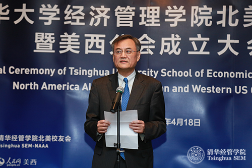 中国驻旧金山总领馆副总领事邓繁华在致辞中代表驻旧金山总领事馆向清华经管学院北美校友会暨美西分会的成立表示热烈祝贺。他指出,旧金山硅谷地区作为世界创新之都,具有独特的创新基因和创新文化,汇聚了全球先进的创新资源和各类高端人才。在硅谷成立清华经管学院北美校友会占据天时、地利、人和。他希望校友会充分发挥自身优势,进一步搭建好学习交流、增进友谊、合作共赢的平台,为推动中美两国科技、文化、教育等领域的交流合作作出贡献。