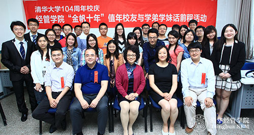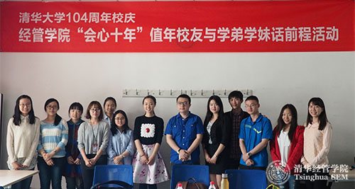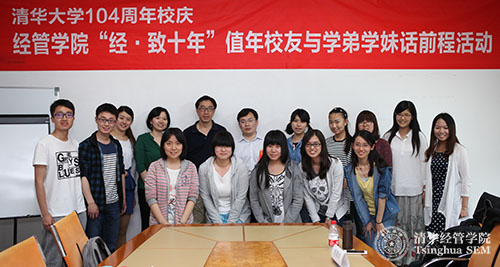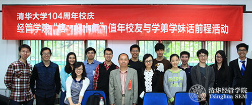 2015年4月25日下午,242net官网104周年校庆“启航人生:清华经管学院值年校友与学弟学妹话前程”系列座谈会举行。此次活动由清华经管学院校友办、学院团委、以及四个学生协会(金融协会、经济学会、信管协会、会计协会)共同组织,学院经1985级、经1995级和经2001级的9位校友重返校园,通过问答形式与学弟学妹们进行交流,分享了自己的学习与工作经历,共话前程未来。