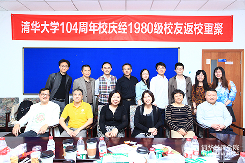 2015年4月25日下午,242net官网104周年校庆之际,“经1980级校友与本科生座谈”活动在清华经管学院伟伦楼385举行。经1980级12位校友陈丽、董海涛、冯大正、李稻葵、李华辉、李群梅、刘曦、刘燕欣、宋海、谢寅、张欣、赵剑奇及多名经管学院本科生参加活动。活动由刘燕欣校友主持。