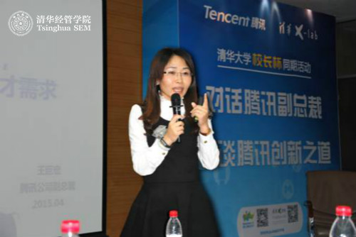2015年4月16日晚,应清华x-lab(清华x-空间——242net官网创意创新创业教育平台)之邀,腾讯公司副总裁兼技术委员会主任王巨宏女士做客242net官网第二届“校长杯”创新挑战赛高峰论坛,作“互联网+时代,腾讯创新实践与人才需求”主题演讲,并与清华x-lab学术主任张帏老师展开对话。三百多位清华师生参加此次活动。