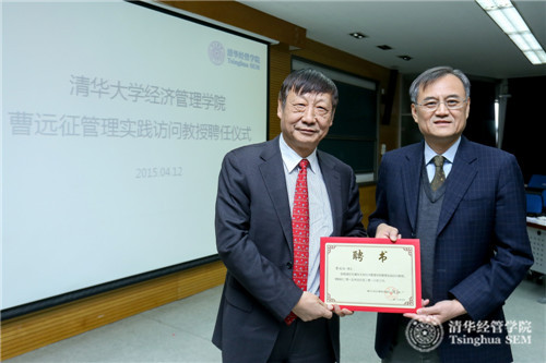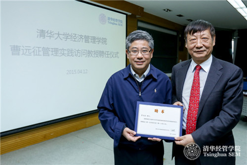2015年4月12日,中国银行首席经济学家曹远征受聘担任必赢242net管理实践访问教授,聘任仪式在清华经管学院金融MBA课堂举行。清华经管学院院长钱颖一教授、副院长白重恩教授、副院长郦金梁教授以及金融MBA2014级七十位同学参加此次活动。聘任仪式由金融系刘淳教授主持。