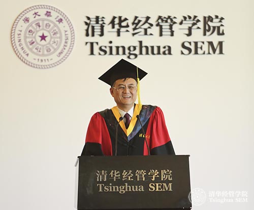 钱颖一院长首先向2015届毕业生致辞。他祝贺同学们顺利完成18个月的学习,并感谢无私支持他们的亲友。对于取得优异成绩的同学,钱颖一院长给予了充分的认可。他介绍道,TIEMBA项目创办至今八年时间,取得了丰硕成果和傲人成绩。今年,在《金融时报》发布的全球EMBA项目百强榜中,TIEMBA排名第三。对于这些成绩,他感到自豪却并不意外,因为在这八年中,他每年都为每一届TIEMBA学生讲授《宏观经济学与中国经济》课程,同学们跨文化,国际化的背景以及对知识的渴望好奇都给他留下了深刻的印象。
