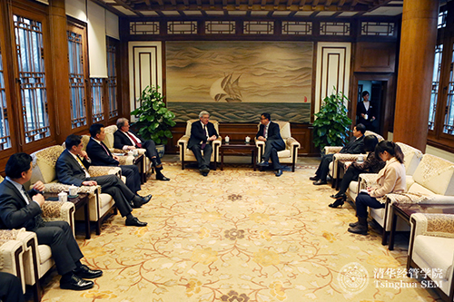 法国巴黎银行集团Jean Lemierre董事长一行访问清华经管学院(左起:法国巴黎银行集团资产管理公司中国区总经理Danny He、集团投资大中华区负责人Tan-Feng Cheng、大中华区负责人兼香港分行行政总裁Paul Yang、集团董事长Jean Lemierre、清华经管学院院长钱颖一教授、中国企业全球化研究中心主任贾宁教授、法国巴黎银行亚太区行政总裁Eric Raynaud、集团中国区首席代表Bruno Weill)