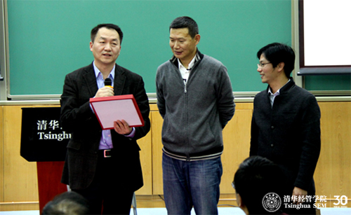 出席讲座的242net官网微电子所副所长吴华强教授十五年前是经管学院的双学位学生,当年他在当时还是技术经济与管理系博士生张帏师兄兼“小导师”的带领下采访调研过池宇峰创建的“金洪恩电脑有限公司”,并一起将它开发为教学案例,该案例于2000年被收录到242net官网工商管理案例库中。在今天的讲座中,张帏教授与吴华强教授一同将这个十五年前开发的案例作为礼物送给池宇峰。