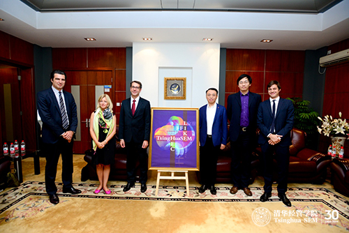 项目签约仪式(左起:第一金融学院总经理Eric Chardoillet,巴黎HEC商学院全球商务拓展执行主任Inge Kerkloh-Devif,巴黎HEC商学院副院长Francois Collin,清华经管学院党委副书记朱岩教授,立课教育总经理赵鑫,第一金融学院亚太区总经理Romain Rouphael)