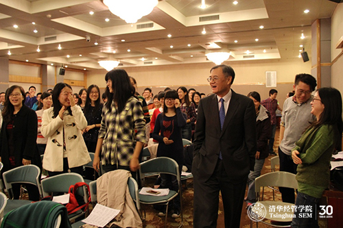 值得一提的是,此次获奖离不开学院领导与老师们的大力支持。在今年的比赛筹备期间,清华经管学院院长钱颖一教授专程来到排练现场探望同学们,为参加比赛的经管三字班同学鼓舞士气。钱院长对同学们的演唱予以了高度的评价,并满怀信心地告诉大家,凭借经管同学过人的天赋与刻苦的训练,一定能在比赛中脱颖而出。学院领导对此次歌咏比赛的重视正是学院重视通识教育的体现,经管学院摘得综合一等奖的桂冠,也正是经管学院实行有别于其他院系的通识教育的成果。