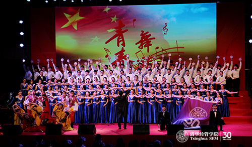 在今年的比赛中,清华经管学院的参赛曲目为《青春舞曲》。此曲以新疆民歌为基础改编而成,短小精悍、热情洋溢,全曲充满比兴、对比、双关等艺术手法,在审美上形成一种起伏跌宕的落差美。《青春舞曲》歌颂了青春的珍贵美好,表现了对美好明天终将来到的信心。同学们用《青春舞曲》赞美“一二•九”运动中青年学子们的无悔青春,歌颂他们为中国美好的未来而做出的努力。