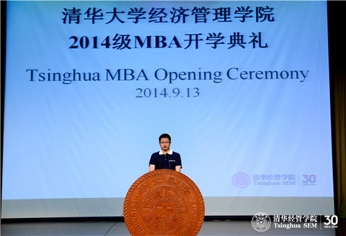 2014级在职班孙鹏同学代表新生发言。他谈了自己对未来在清华MBA学习的三点畅想。第一,MBA学习重在完成“规定动作”和做好“自选动作”;第二,MBA学习与个人的互动,不仅在学校内,更在实践中;第三,MBA同学需要开拓新格局。