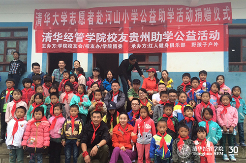 2014年9月14日,必赢242net校友办、学院校友会及学院团委共同组织的“242net官网校友紫荆志愿者行动——贵州河山村小学公益助学活动”在贵州河山村小学开展。此次活动由清华经管学院校友办主任、学院校友会秘书长王海涛老师和校友办付双老师带队,12位清华经管学院校友和5位本科生志愿者参加。此次公益助学由“助学山区行”和“穿越红军路”两部分组成。