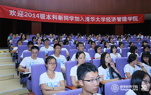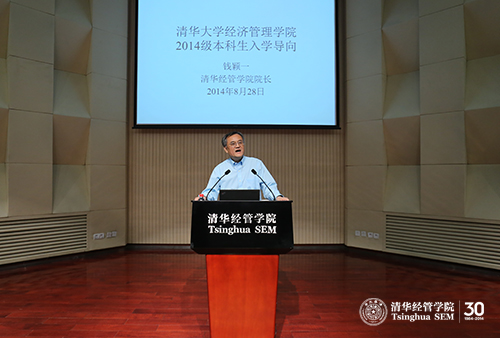 钱颖一院长首先讲述了清华校名、校徽的变迁以及百年文化传承。清华经管学院继承了清华“中西融会、古今贯通、文理渗透”的传统,以“创造知识,培育领袖,贡献中国,影响世界”为使命,并在今年提出了学院的核心价值:对己,正直诚实(Integrity);对事,敬业尽责(Dedication);对人,尊重宽容(Respect)。钱院长还与同学们分享了建院30周年活动上,朱镕基院长来信中对于学院30年发展的评价和对学院未来的期望。