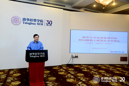 郦金梁教授首先祝贺同学们成为清华经管学院2014级硕士研究生。他介绍了会计硕士、金融硕士、管理硕士三个项目的区别与联系,提醒同学们不要局限于本专业的学习,而要放开眼界。随后,他着重介绍了应用型硕士项目的特点,希望同学们提早做好职业身涯规划,明确自己现在需要什么,未来想做什么。