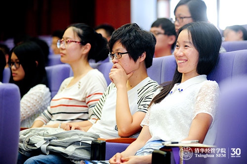 最后,徐心教授作为教师代表为新生致辞。他告诉大家做好学术研究最重要的有两点:一是要有积极向上的精神状态,二是要有加倍的投入。首先,积极向上的精神状态并不是没有根据的积极,而是应该寻求一些原因,从内心真正地认同自己所做之事的重要性和崇高性,同学们赶上了一个很好的时机,学校、学院近几年从各个角度对资源进行了整合,为大家提供了良好的求学环境,同时中国千变万化的社会经济环境也产生了很多有趣的社会经济现象,供大家去关注与研究,这些都可以是我们积极向上的原因。其次,同学们要对自己所做之事有加倍的投入,他认为清华经管学院的学生与北美一流高校的学生最大的区别不在于学术程度,也不在于学术环境,而在于投入的程度,同学们要时刻对自己的学习计划、投入的时间与程度进行自省,在自省中不断努力,从而获得进步。