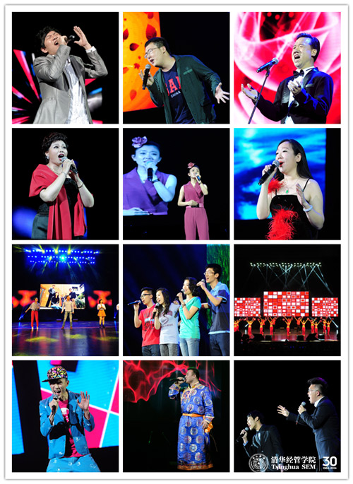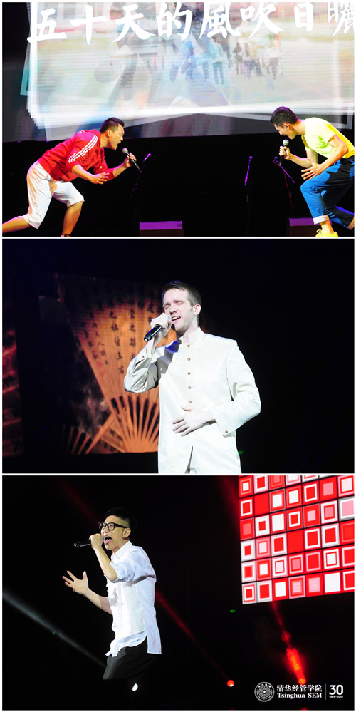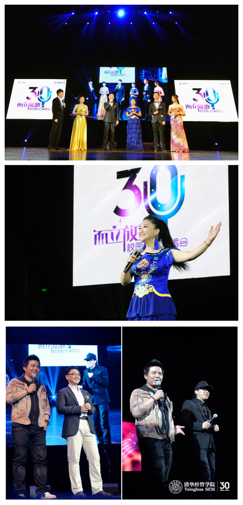 “而立放歌”集聚30年来活跃在清华舞台上的师生校友,囊括了30年来流行于校园的数十首代表性作品。通过歌声回顾30年来学院、学校和整个中国社会的风貌变迁成为本次晚会的主旋律。精彩的开场视频后,三位校歌赛冠军:魏晨阳(经1991)、董丁(经2003/MBA2011)、查迪(经2009/经硕2013)分别从舞台和观众席闪亮登场,演绎经典曲目:《光阴的故事》、《同桌的你》和《那些年》,瞬间把大家的思绪带回到歌声中的年代,以怀念和重温的情怀,拉开了“歌声飘过清华园三十年”的主题序幕。