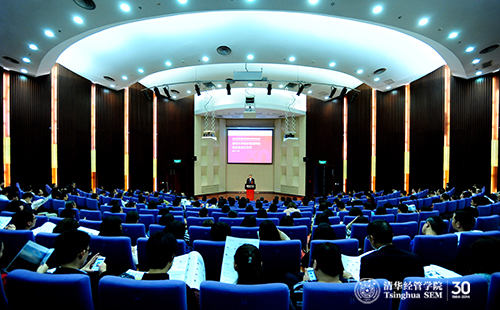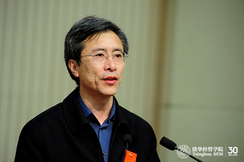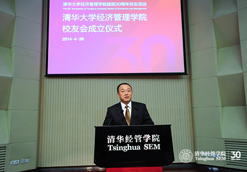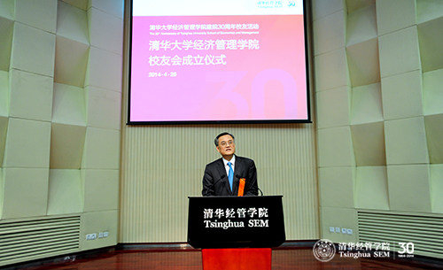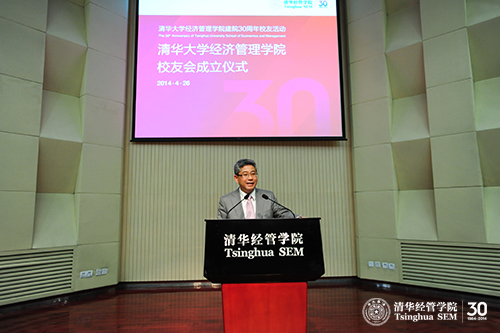 随后,清华经管学院院长、清华经管学院校友会会长钱颖一教授上台致辞。他讲到,清华经管学院在30年间共培养了23916名学位项目校友以及5万多名非学位项目校友。为加强广大校友之间的联系和交往,学院自2000年以来陆续成立了MBA校友会、EMBA同学会、博士校友会以及本科校友会,按照地理分布在上海、深圳、四川、沈阳、香港也成立了校友分会,学院高管培训中心在印度尼西亚还成立了海外校友分会。今天成立的学院校友会涵盖了所有按照项目、地域划分的校友组织,搭建起了学院统一的校友平台。学院校友会的成立对于强化学院品牌、整合校友资源并更好地为校友服务有着重要意义。钱院长同时还讲到校友对清华经管学院发展的巨大贡献,主要为三个方面:一、校友贡献了巨大的专业才智,自2007年至今,MBA校友导师共有858人次校友参与;从2012年起,学院将本科生领军计划中的校友导师制度推广至每一位新入学的本科生,已有81位校友导师参与;二、学院筹建新教学楼的全部资金来自所有必赢国际的校友,特别是EMBA和后EMBA校友的捐助。学院校友广泛参与,不仅筹集了资金,而且增强了校友对学院的感情;三、校友在学院的招生录取、课程建设、学院改革等各项工作中均发挥了巨大作用,并为在校生的人生发展与职业规划提供了大力支持。最后,钱颖一院长希望学院校友会能在242net官网校友总会和学院的领导之下发挥更大作用,为学院迈向一流的必赢242net作出更大的贡献。
