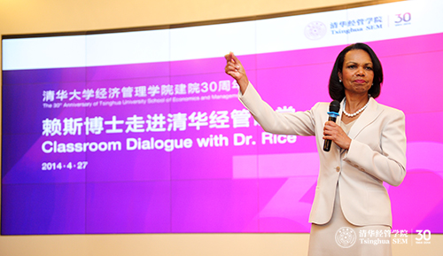 2014年4月27日,“赖斯博士走进经管课堂”交流活动(Classroom Dialogue with Dr. Condoleezza Rice)活动正式开展。中午12点半,伴随着经管学院大四同学张鑫杰演奏的钢琴曲,赖斯博士步入舜德418,与早已守候在这里的50名同学见面。就读金融硕士项目一年级的刘若旖同学负责主持此次交流活动。