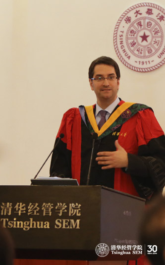 接着,2011届TIEMBA校友Gregory Fossey上台发言。他回忆道,三年前,他也是在这间多功能厅参加自己的毕业典礼。毕业时,他心情复杂,尽管再没有繁重的课业压力,却觉得茫然若失,面对与老师和朋友的离别,他深深感到不舍。现在,他为自己当初的选择感到骄傲,在TIEMBA他不仅学到了知识,更增强了应对挑战的能力。Gregory Fossey代表校友衷心感谢清华与INSEAD通力合作创办了这一项目,并且致力于提高其国际影响力,为学生的发展带来了很多益处。最后,他向2014届毕业生表示祝贺。