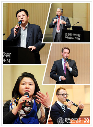 现场特邀嘉宾,巴黎HEC商学院特聘教授,路易威登(Louis Vuitton)前首席执行官Prof.Vincent BASTIEN,时尚集团时尚学院副院长瘦马先生,萧邦珠宝中国区销售总监Mr.Tasso Von Berlepsch,以及上海奥美公关副总裁蔡珍玲女士,与350多位校友共同探讨如何通向顶级奢侈品品牌之路。