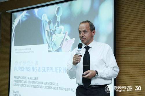 本学期的最后一次课程为“采购与供应链网络”,宝马集团高级副总裁、宝马中国服务有限公司总裁菲利浦•埃勒先生(Philip Eller)与清华经管学院80余名同学进行了讨论和交流。