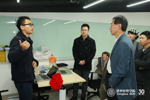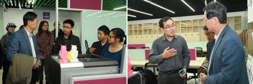 在清华x-lab场地,姜胜耀副校长一行了解了正在场地工作的其中四支创业项目团队——AOD3D智能打印机团队、孕橙女性基础体温计团队、创行青年团队、诚运商团队的运营情况。在场的投资界校友齐继国向姜胜耀副校长介绍了自己如何被清华x-lab吸引自愿参与其中帮助学弟学妹的情况。
