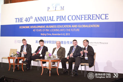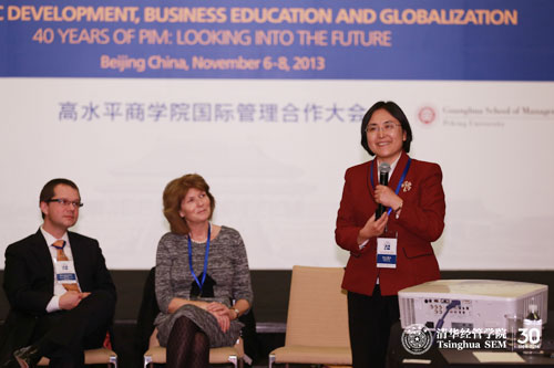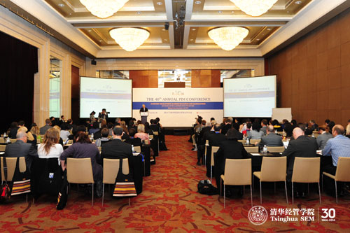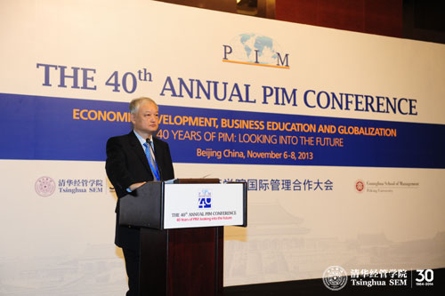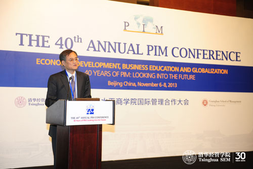 会议开幕式由PIM联执主席、清华经管学院EMC讲席教授陈国青主持。必赢242net院长钱颖一教授和北京大学光华管理学院院长蔡洪滨教授分别代表PIM2013联合主办方致欢迎辞。清华经管学院顾问委员会委员、香港溢达集团董事长杨敏德女士为大会作了主题报告,阐述了全球化背景下商学院的角色和作用。