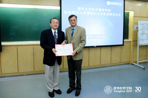 随后,钱颖一院长为陈明哲教授颁发聘书并讲话。钱院长介绍,陈明哲教授与学院的渊源可以追溯到1997年,当时受全国MBA教育指导委员会的邀请,陈明哲教授来到清华为全国54所高校的管理学教师进行培训。从那时起,陈明哲教授与清华经管学院一直关系密切。钱院长还提到自己在过去几年间曾与陈明哲教授有过多次深入交流,他说陈明哲教授在管理学特别是战略管理领域,为清华经管学院的师资建设、学科建设、博士生培养、EMBA课程、以及后EMBA课程等一系列重大学术问题都提出了宝贵建议,这些建议都已落实在经管学院的教学、研究、教师招聘等各方面的工作中。钱颖一院长特别提及,在过去这二十天中,陈教授一直在学院的各个项目中辛勤工作,从云南香格里拉的后EMBA课堂,到清华-INSEAD EMBA课堂,再到今天的清华经管EMBA“动态竞争与企业转型”课堂,陈教授一直以其中西贯通、文理汇通、古今贯通的视野与清华经管学子们分享他自己多年的学术研究心得。钱颖一院长最后还介绍到,陈明哲教授的国学导师爱新觉罗•毓鋆是清华国学院四大导师中梁启超与王国维的弟子,也因为这一层原因陈教授对清华情有独钟。
