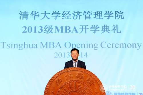 清华经管学院金融系教授杨之曙老师作为教师代表发言。杨之曙教授首先代表全体教师欢迎新同学的到来,他以“中国梦”为题,告诉同学们学经济也要懂政治,他说,不懂政治,就会迷失方向。杨之曙教授说,企业家是中国经济的创造者,中国经济要腾飞,必须要有不断壮大的企业家队伍,他倡议同学们不断努力,为实现“中国梦”贡献一份自己的力量。