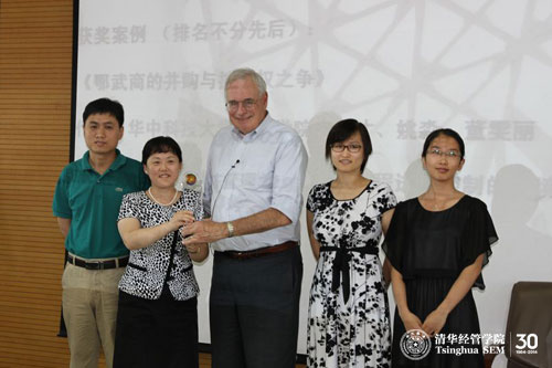 在本届麦克法兰案例奖颁奖环节,夏冬林教授客观而详细地介绍了评选规则,华中科技大学王诗才、姚淼、董雯丽所开发的《鄂武商的并购与控股权之争》,北京航空航天大学周宁、韩小汀、申金永、胡婷婷、邹艳合作开发的《有米难为炊的NOC项目:海外EPC工程进度控制的困境》案例获得本年度案例奖。麦克法兰教授为两篇获奖案例颁奖。(供稿 案例中心 编辑 沟通办)