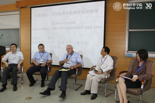 “会计类案例开发和使用主题”论坛是本届会议的亮点。这一环节由麦克法兰教授、清华经管学院副院长夏冬林教授、中石油中亚天然气管道有限公司总会计师张少锋先生、中国媒炭科工集团天地科技股份公司副总经理兼财务总监宋家兴先生共同参与,分别从会计案例开发、会计案例应用等方面与现场来宾交流。