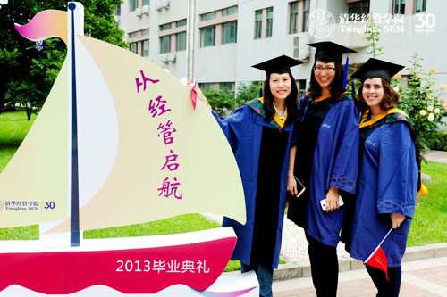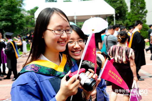 毕业生招待酒会是今年学院系列毕业庆祝活动的一个新亮点,它突破了以往传统的室内活动,将庆典延展到户外进行,同时给了毕业生之间以及和师生们更多的空间彼此问候、交流和相互祝贺。活动当天,伟伦楼、舜德楼的大厅以及两楼之间的中庭被气球、彩带、合影背景板、凉亭等装饰一新,在绿草的映衬下体现出节日般的喜庆气氛。